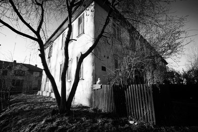 Кошка белая на заборе сидит в Озерках у дома с деревом весной