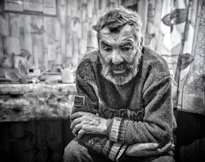 Звезда на левой руке и надпись на старом свитере "EXTRIM", лицо - зеркало прожитого - всё работает! /скатерть снизу и остатки застольяможно было так не размывать, а только штору. А стол - чуть темнее./