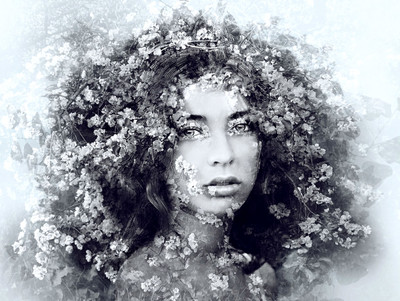 Использованы два моих снимка. Портрет и цветущая яблоня. Имитация мультиэкспозиции.