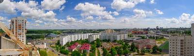 Панорама на минский микрорайон Веснянка. Слева-направо: проспект Победителей, футбольный манеж, отель Marriott, Орловская, Тимирязева