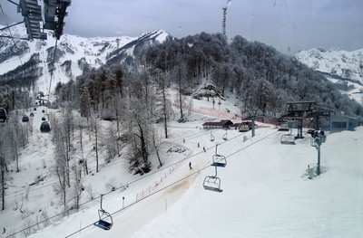 Вид из кабины подъемника в горно лыжном курорте Роза Хутор
