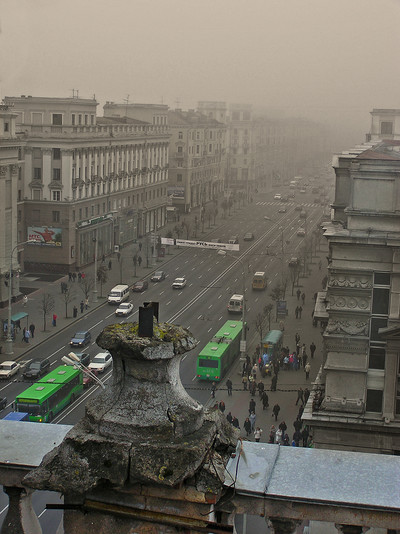 Пролетая над проспектом Проспект Независимости в Минске. Ранее назывался проспектом Франциска Скорины, проспектом Ленина, проспектом Сталина, Хауптштрассе (время немецкой оккупации), улицей Советской (с 1921 по 1933 год), улицей Адама Мицкевича (время польской оккупации), улицей Захарьевской (современный участок от площади Независммости до площади Победы (по имени минского губернатора Захария Корнеева). |