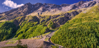 Интересное фото в музыкальном сопровождении! Скалы, местами снег и насыщенная зелень! Хотелось бы узнать, что за небольшие пирамиды виднеются? Это каменные постройки?