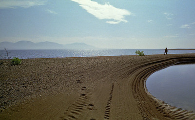 Озеро , песчаная коса , человек .