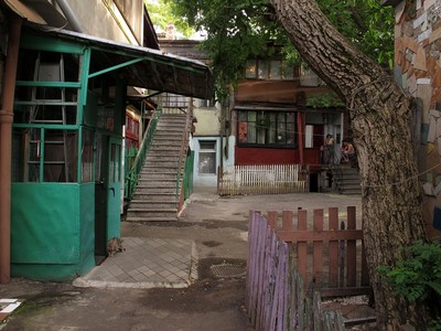 Без названия Одесские дворики... Это особая страница в истории Одессы, где "Многие хотят родиться, но не у всех это получается...". Об одесских двориках написано, спето, нарисовано, придумано и снято огромное колличество песен, стихов, картин, фильмов и анекдотов именно потому что в этих двориках хранится самая главная тайна одесского колорита. Однако каждый старый дворик в Одессе неповторим своей историей. Итак, ул.Колонтаевская 21... Заходишь в этот дворик на Молдаванке и удивляешься тому, насколько он до мозга костей одесский, этот двор почти не нуждался в дополнительных декорациях и особой переделке - здесь все та же старая Одесса, которой 21 век почти не коснулся. Сразу узнается лестница, по которой ходили тетя Песя и Эмик, и куда тащили приданое Цили, зверюгу пианино))), окна квартиры Давида Марковича, дерево, где крепился умывальник, и крылечко, на котором любил сидеть вор в законе дядя Ешту. Да, именно здесь снимали "Ликвидацию". Из путеводителя по славному городу Одесса |
