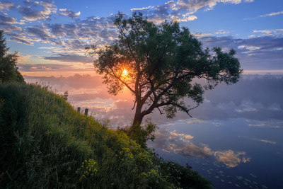 Первые лучи солнца пробиваются сквозь туман и крону дерева у реки.