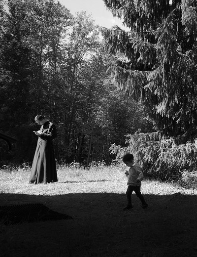 Лето лес ребенок послушник возле храма