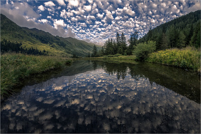 Schäfchenwolken Spiegelung im Eselsgraben in der Steiermark.