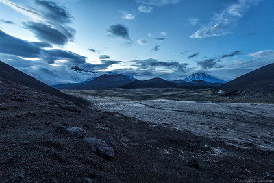 Марсианский пейзаж Толбачинского дола и вулканы Толбачик и Большая Удина. Россия, Камчатка.