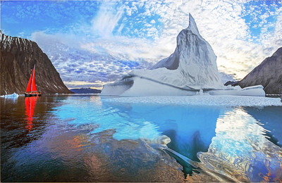 Классная перекличка героев (парусник и айсберг + небо и море), шикарная текстура гор-неба-снега-льда-ряби на море и все это великолепие на фоне богатых красок и полутонов переходов. Очень интересная S "татуха" из цветных разводов (пластика перевоплощения). Обалдеть - так держать.