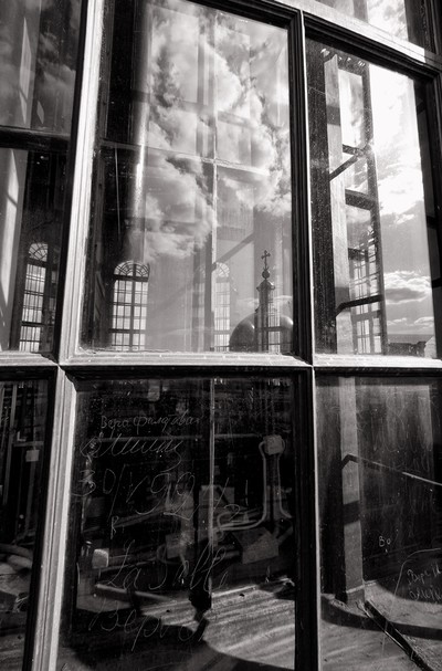 Без названия Колоннада смотровой площадки Исакиевского собора. Обратите внимание на дату создания автографа некой Верочки Филатовой на оконном стекле. Возможно ли, чтобы это стекло уцелело? |