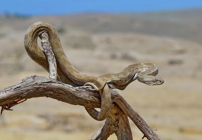 Гюрза забралась на остатки высохшего дерева, спасаясь от раскаленных за день камней