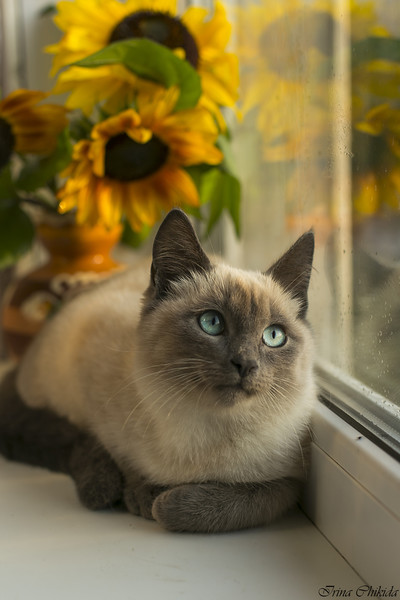 Хорошо подчеркнуты голубае глаза на фоне дополняющего цвета (ораньжево-желтого), мягкий фокус да по мягкой серой шубке, да серое граммотно (оптически) мягко уходящее в боке стекло с изюминкой (каплями после дождя), создает уют и тепло, а именно кошка ассоциируется с уютом и теплом дома.