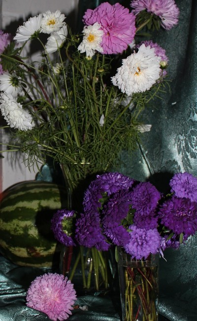 Вечер,дача,цветы. В этом году бабье лето завершалось ни только красотою лужаек безвременника, но и поразительной красоты кустов махровой космеи, и изумительные огромные георгины слегка задержались и составили кампанию осеннего великолепия. Ставлю эту работу в знак приветствия промышленно-дачному городу, принявшему на своей территории Первый фестиваль песочной скульптуры Новосибирской области. |