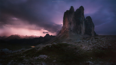 Tre Cime di Lavaredo, Безумие День близился к закату , и вместе с этим надвигались тучи. "Вот, наконец то"-говорил я сам с собой. Тучи пришли, а за одно они принесли сокрушительные раскаты грома и сотню вспышек молний. Мне казалось, что я смогу укрыться, чтобы особо не промокнуть, но я ошибался. Мне хотелось снимать, но я не мог, много ветра и воды не позволяли мне этого делать. Я прикрывал своим телом камеру и документы, и ждал пока стихнет мощь молний и дождя. Я весь промок и думал: "Какой же я дурак, что остался ждать здесь в дали от укрытия. Все равно ничего не снял". Разряды молний были одна за одной. Такого я никогда не видел и не слышал в своей жизни. Это был тот случай, когда подводный бокс для фотокамеры оказался бы в самый раз. Когда уже все практически стихло я сделал несколько снимков прижимая камеру к камням. "О черт"- сорвалось у меня из уст, когда на одном из выступе Tre Cime я увидел мерцающий свет. Я думал, что это я сумасшедший, оказывается в это громовое время на выступе, наверху , были люди. На фотографии видна световая точка. "Безумие"- больше мне нечего было сказать ни про них ни про себя. Спустя время я слышал несколько восторженных голосов спускающихся с вершины людей. |