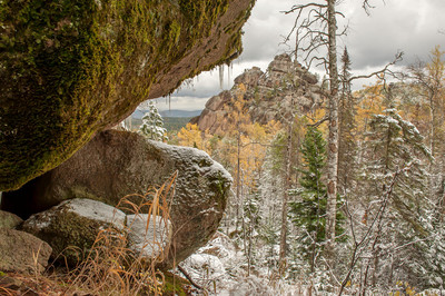 Пред зимнее состояние осени... Красноярский природный заповедник "Столбы". На ЗП виден "Первый столб" заповедника. Снимок сделан, со спуска "Второго столба". Рано утром был снег, а спускаясь вечером в низ, вся красота просто растаяла... А так всё было красиво !!! |