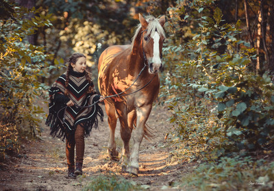 Задушевный разговор девочки Анюты с лошадью Фоксом в солнечном осеннем лесу.