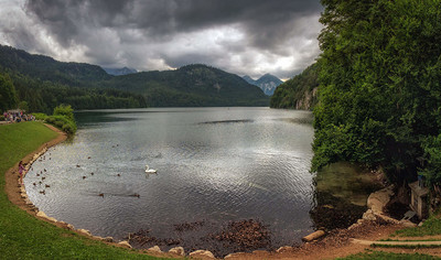 Хмурое утро Лебединого озера Говорят сюда приезжал П.И.Чайковский за музой и, впечатлённый видами на берегах Шванзее, написал свой знаменитый балет. Можно его понять, ведь кроме озера,справа от этого места и чуть вверх - замок Хоэншвангау, фамильное гнездо Виттельсбахов, а позади снимающего этот кадр, в горах,сказочный замок Нойшванштайн... http://www.youtube.com/watch?v=xsUxb6Lv1Sc |