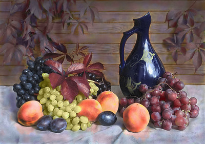 Натюрморт из фруктов, листьев винограда и кувшина.