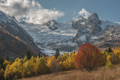 Гора Эрцог (3683 м) и Алибекский ледник Алибекский ледник-Протяженность ледника составляет 4,6 километров. Он расположился на территории в 975 гектар. Из-за глобального потепления размеры ледника постоянно сокращаются. |