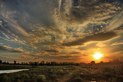 Вечер.Живописное небо.Пруд.Закатное солнце.