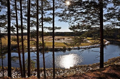 Солнце на реке в соснах