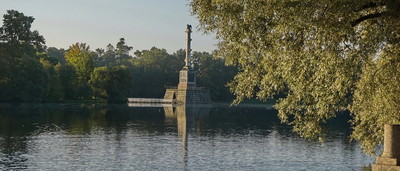 Чесменская колонна Чесменская колонна поставлена посреди Большого пруда в честь победы русского флота в 1770 году в Чесменском сражении над турецким флотом. Сооружена в 1771—1776 годах по проекту архитектора А. Ринальди и скульптора И. Г. Шварца. 22-метровая колонна из олонецкого розового мрамора стоит на четырёхгранном гранитном основании. Ствол колонны завершён аллегорической скульптурой: бронзовый орёл ломает турецкий полумесяц |