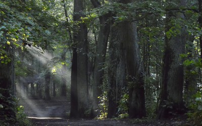 Красиво лучи пробиваются сквозь тяжесть крон деревьев!