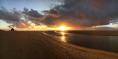 Закат освещает реку, впадающую в Тихий Океан (ручей Экола). То же место и время, что и на предыдущем снимке - Кэннон Бич, Орегон. 3 ноября 2017 года.