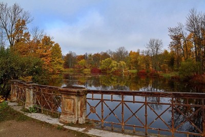 Пушкин. Александровский парк Большой Ламский мост через Большой Ламский пруд. Построен в 1822 г., архитектором Менеласом А.А., реконструирован в 1890-х годах архитектором Видовым А.Ф. Интересен тем, что был одним из первых в России железных мостов (т.е. металлических) и повторяет в очертаниях Первый в мире железный мост через реку Северн в Англии. |