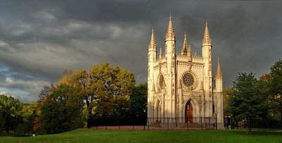 Вечерний свет капеллы Санкт-Петербург Петергоф Парк Александрия Готическая капелла Це́рковь свято́го Алекса́ндра Не́вского — недействующий православный храм в Петергофе, в парке Александрия. В обиходе известен как Капе́лла. В 1829 году, после завершения строительства Коттеджа, возникла необходимость в домовой церкви. Место для будущей домашней молельни в западной части Александрии выбрал сам Николай I. Проекты фасадов и планы были выполнены известным немецким зодчим К.-Ф. Шинкелем, а непосредственное наблюдение за строительством осуществлял архитектор А. Менелас, после кончины которого, с сентября 1831 года эта роль была возложена на архитектора И. И. Шарлеманя. Торжественную закладку церкви совершил 24 мая 1831 года духовник Императора протопресвитер Николай Музовский в Высочайшем присутствии. Летом 1834 года строительство было закончено, и 3 июля 1834 года состоялось торжественное освящение церкви во имя святого благоверного великого князя Александра Невского, совершённое тем же протопресвитером Николаем Музовским в Высочайшем присутствии. Храм являлся домовой церковью императорской семьи, богослужения в нём проводились только в летний период. |