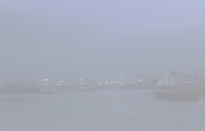 Вид с моста на город ,октябрь, уже довольно прохладно,поздняя осень, к вечеру туманная дымка ровным слоем накрыла окружающее пространство, через час резким порывом ветра принесло мокрый снег и позёмку и на другую сторону моста уже шли зимним вечером:-).