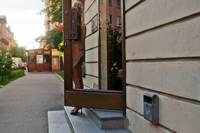 плоскость стены пересекается плоскостью двери, где в стекле отражается ещё плоскость фасада, которую мы не видим, она как позади нас. Объёмная.