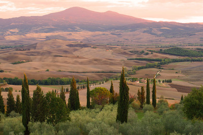 Вид на окрестности Пиенцы осенним вечером. Тоскана, Италия