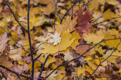 Во время листопада, осенним утром, кучка листьев сложились на ветвях, кустик с листьями, кленовые опавшие листья среди ветвей, осенним утром, среди деревьев, в осенней аллее