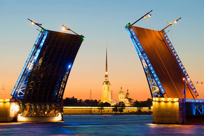 Разведеный дворцовый мост крупным планом белой ночью. Санкт-Петербург