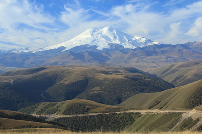 Самая высокая гора,как в России так и в Европе.Фото было сделано в КБ за 30 км от Эльбруса на высоте 3200 над уровнем моря.Высота самого Эльбруса 5642 метра.