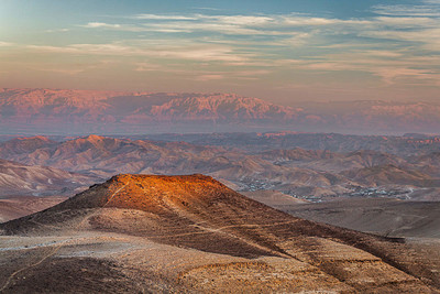 Заходящее солнце бросает последние тёплые лучи на вершины гор.На заднем плане уже Иорданские горы