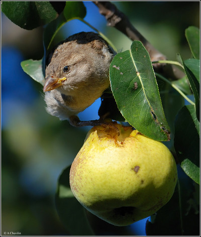 Молодой воробей лакомится грушей