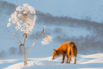 Камчатка. Лисица около высохшего ст... Борщевика.