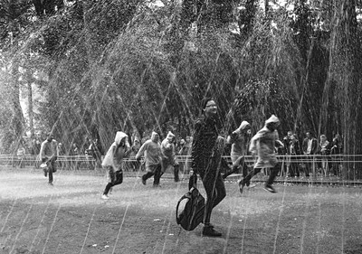 , перебегают через "шутейный" фонтан - в Петергофе. Все бегом и в плащах,а девушка шла не спеша,наслаждаясь струями фонтана.Впечатлила.