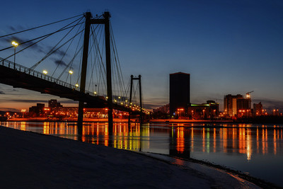 Виноградовский мост, соединяющий остров Татышева с городом вечером.