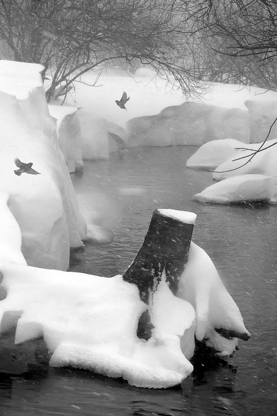 Ева Дудорга, Летают! Когда добралась до ручья, стая большая взлетела! Радости не было границ. В обычную погоду пять минут до ручья от дороги, а тут ушло несколько часов...толщина снега большая,иногда по пояс, тропинок нет, но я ведь ждала этого для снимка.... Когда дошла, чувство внутреннего ликования и они.....птицы....взлетели буквально из под ног...) Сидели под сугробами и пили воду! Есть ещё кадры с птицами...как пьют воду даже, но качество ещё хуже..объектив ..снимать в снег и ветер, что в дождь..правда у меня свои секреты тут, но они не всегда спасают. Пробыла там ещё несколько часов..снег то шёл, то нет..птицы конечно попрятались. Потом ещё и ещё новые ощущения..домой вернулась счастливая, как слон!!!!