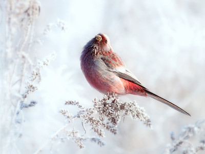 Зарисовки из зимнего луга Не всем известна, но очень интересна птица урагус. Ее небольшие размеры и яркое оперение поражают своей необычностью. Чаще всего встречается название длиннохвостая чечевица, в некоторых случаях длиннохвостый снегирь. Очень широко распространены урагусы в Азии. Ареал их обитания включает Монголию, Китай, Японию, Казахстан, Корею, Кыргызстан, южные районы Сибири. Она представляет собой маленькую птичку с очень длинным хвостом, который в основном служит ей для баланса. Имеет дружелюбный характер и мелодичное пение. Трели выводят только самцы, самки могут лишь скромно пищать. Снято Юг Западной Сибири, Тюменская область |