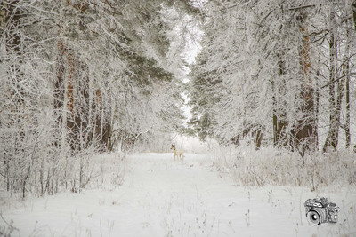 Снежный денек января, прогулка с собакой по аллее в лесу