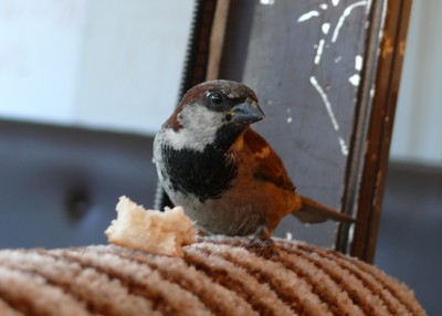 прилетел в летнее кафе воробей и начал чирикать-просить угостить кусочком хлеба