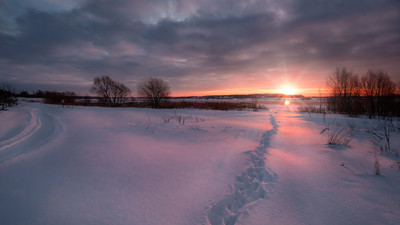 Зима, берег Волги. Короткое явление солнца на хмуром рассвете.