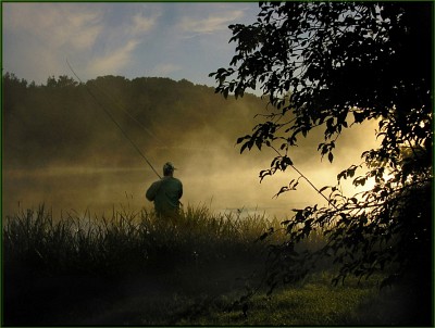 Утренний клёв Очередная карточка из серии "О рыбалке". Хотя правильнее было бы назвать " О рыбалке и рыбаках". В данном случае это пейзаж с очень характерным присутствием персонажа, поскольку отраженный момент является в рыбалке кульминационным и может даже помешать восприятию атмосферы утра, которая здесь все же борется за первую роль. Приятного Всем просмотра. |