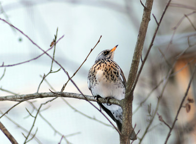 Дрозд-рябинник прилетает к дому в поисках оставшихся ягод рябины.