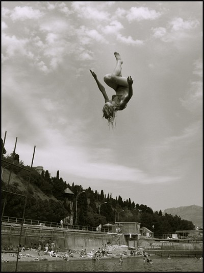 Руслан Карпов, от берега в мореуходят ну чтото типа волнорезов или пристани для лодок а почти в самом конце этого строения 2.5 метровые Т образные штуковины вот Она с них и сигала -а за этот промышленый пляж с людей есчё и деньги брали -прутики это кусок арматурной загородки от желающих на холяву отдохнуть на этом чудо платном пляжике в городе Алушта